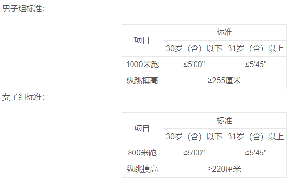 男子1000米跑、女子800米跑两个项目的测评次数均为1次,纵跳摸高的测评次数不超过3次。凡应测项目中任意一项不达标的,即视为体能测评不合格。体能测评不组织补测,体能测评不合格的,不能参加面试和体检。年龄计算时间截止到参加体能测评当月。