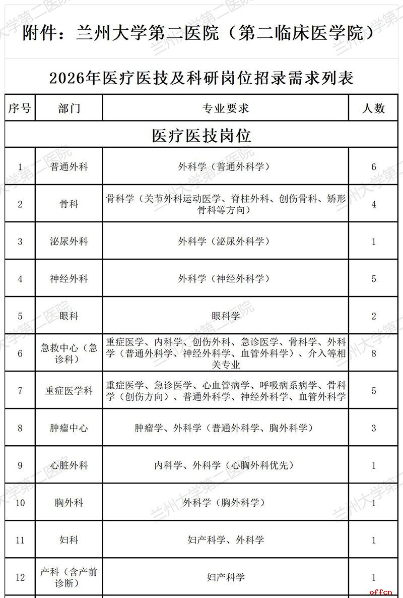 - 2026年甘肃省兰州大学第二医院(第二临床医学院)医疗医技及科研岗位招聘109人公告(第一批) 2025-10-17