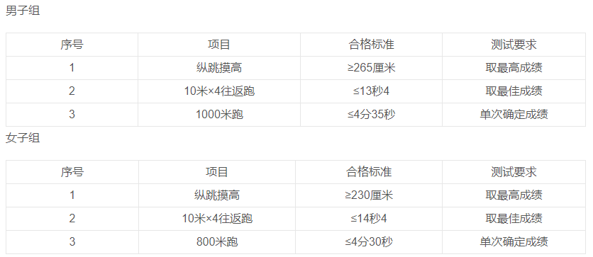 (1)体能测评项目及通过标准:纵跳摸高、10米×4往返跑、男子组1000米跑、女子组800米跑。