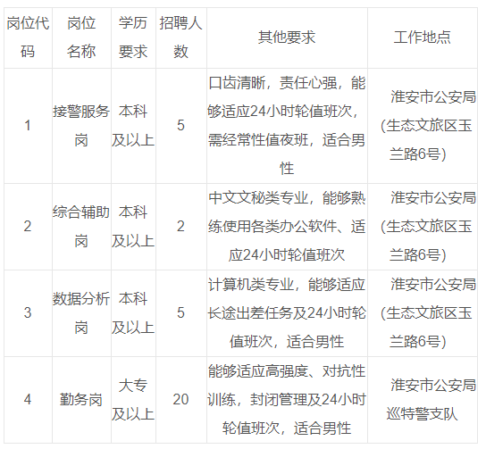 3. 品行端正,诚实守信,志愿从事公安警务辅助工作,具有较强的吃苦耐劳和忠诚奉献精神,能够适应24小时轮值班次;