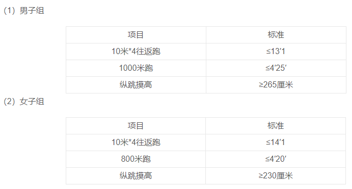 备注:凡应测项目中任意一项不达标的,即为体能测评不合格。对未按规定时间到指定地点参加体能测试的应聘人员视为放弃应聘资格。