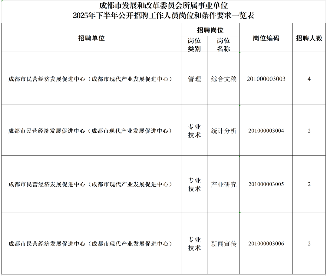 本次共招聘10名。具体岗位和条件详见文末附件1:《成都市发展和改革委员会所属事业单位2025年下半年公开招聘工作人员岗位和条件要求一览表》。