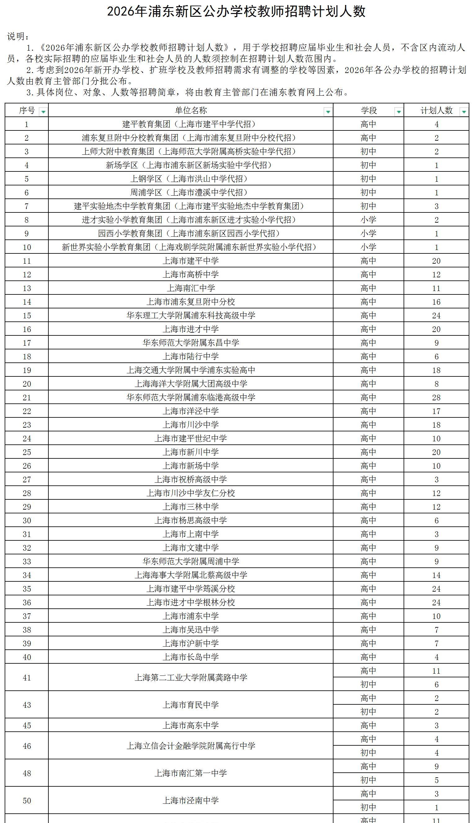 - 2026年上海浦东新区公办学校教师招聘1727人公告(第一批次) 2025-10-15
