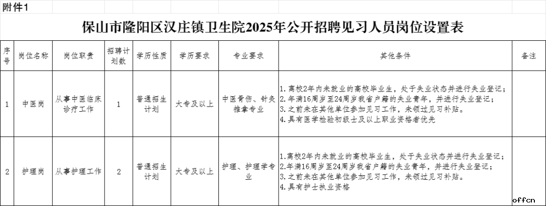 附件1.隆阳区汉庄镇卫生院2025年公开招聘见习人员岗位设置表.xlsx