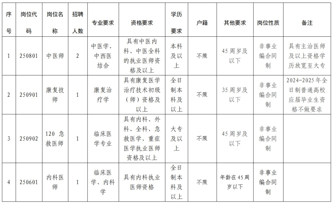 因工作需要,我院拟向社会公开招聘中医师2名,康复技师1名,120急救医师1名,内科医师1名,均属于非事业编合同制。