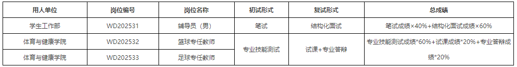 辅导员(男)岗位初试采用笔试的方式组织,采用百分制。根据应聘人员的初试成绩,从高分到低分,按1:5的比例确定入围资格复审和复试人员,如遇最后一名同分的,则一并进入资格复审和复试。