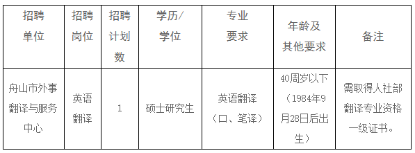 根据《浙江省事业单位公开招聘人员暂行办法》规定,经舟山市人力资源和社会保障局同意,舟山市人民政府外事办公室下属事业单位舟山市外事翻译与服务中心决定面向社会公开招聘工作人员1名。现将有关事项公告如下: